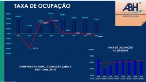 ABIH-SP apresenta, também, o desempenho de TO, DM e RevPar de cada MRT, com a evolução e comparativo desde 2020 até janeiro de 2026. Da TO, 8 MRTs apresentaram alta em relação a dezembro, reduzindo apenas em –0,15% em relação a dezembro/25. Já na DM, 6 MRTs apresentaram baixa, retraindo o consolidado do mês em –0,77%, se comparado a dezembro/25. Já no RevPar, 5 MRTs exibiram queda em relação a dezembro/25, com –0,92% de variação.