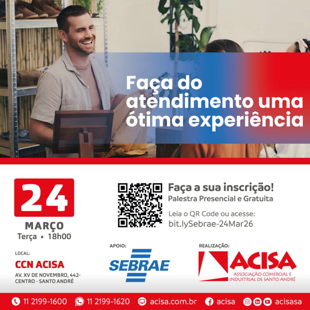 No próximo dia 24 de março (terça-feira), das 18h às 22h, será aberta a temporada 2026 de palestras da ACISA – Associação Comercial e Industrial de Santo André, em parceria com o Sebrae-SP. O tema de estreia será o atendimento ao cliente.