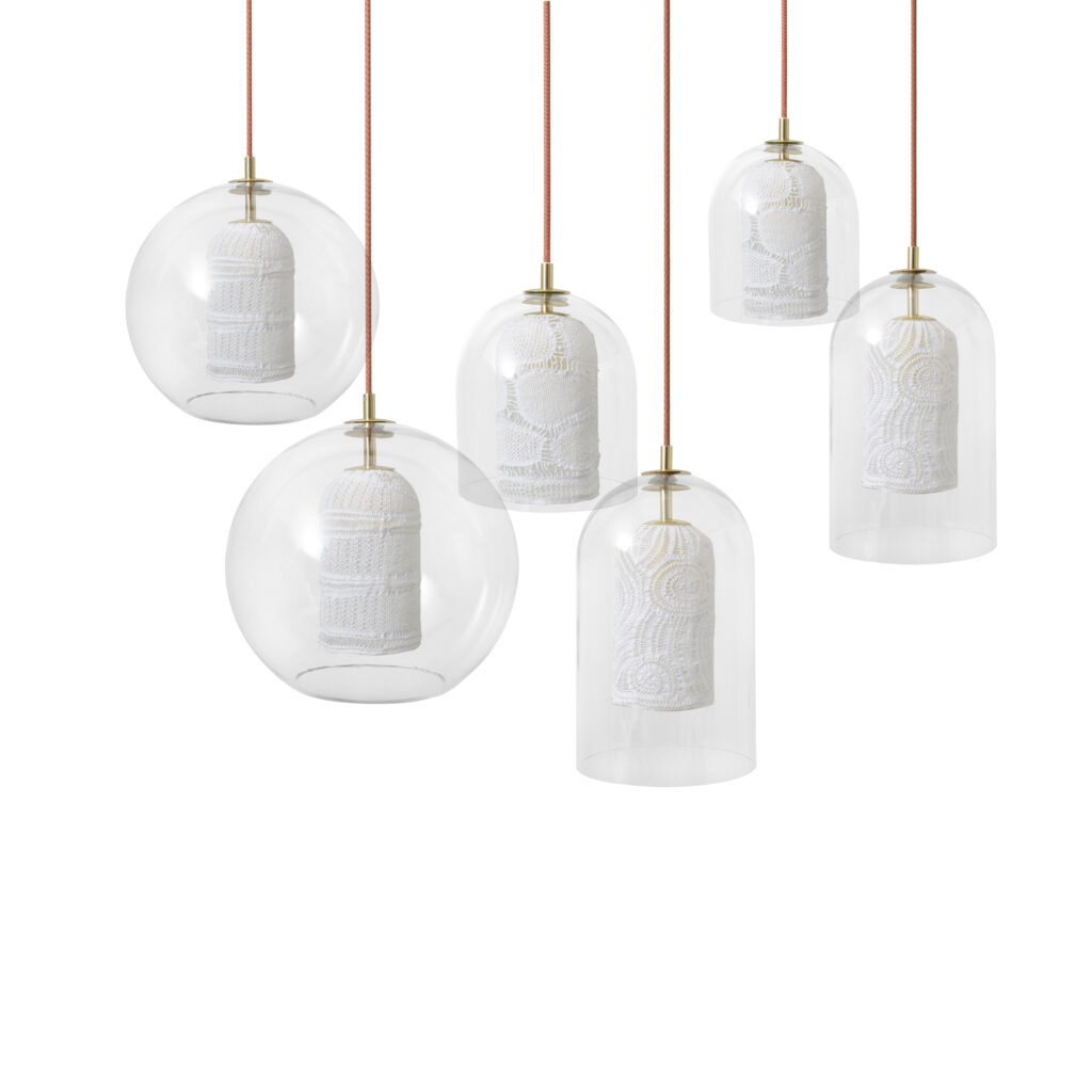 Além das versões em vidro, a coleção também conta com modelos que apresentam cúpulas de latão polido, refletindo as rendas ao seu redor e criando um jogo sofisticado de luz e sombras. Essa combinação de materiais permite composições variadas, agregando leveza, brilho e textura a ambientes residenciais e comerciais.