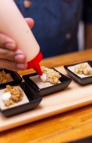 “Começamos com um brinde com espumante de vinhedos locais do sul do Brasil. Iniciamos a degustação com três canapés: Pastel de Vôngole (Berbigão) com aioli e mini brotos; Crocante de mandioca com Carne de Siri e maionese de pimenta dedo de moça; e Tartar de Ostra com crocante e gel de limão”, declaram.