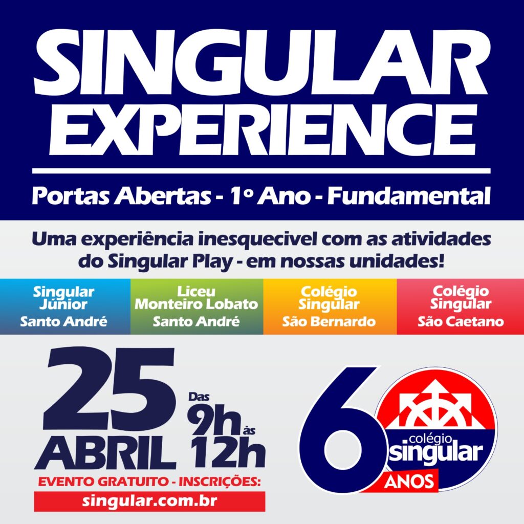 No próximo dia 25 de abril, das 9h às 12h, o Colégio Singular realiza o Singular Experience, um evento gratuito e simultâneo nas quatro unidades localizadas em Santo André (Singular Júnior e Liceu Monteiro Lobato), São Bernardo do Campo e São Caetano do Sul.