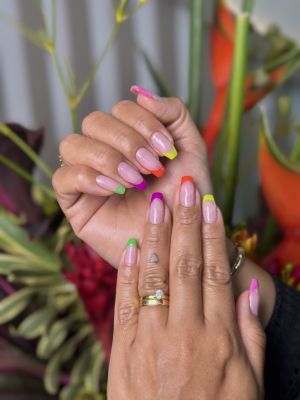 “Essa releitura é ideal para quem quer cor sem exagero, porque mantém a elegância do desenho tradicional com um toque vibrante e atual. O contraste entre a base clara e as pontas neon cria um efeito moderno que valoriza o formato das unhas e combina com diferentes estilos de produção”, conta Aleksandra Francisca da Silva, manicure do Pelle Capelli.