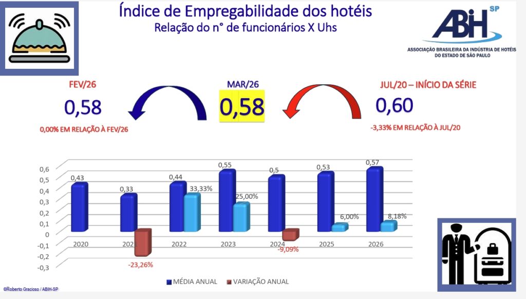 Na análise da relação funcionários X Uhs, em março/26 o índice apresentou estabilidade, ficando em 0,58 – sem variação. Este indicador permanece com tendência crescente. A variação negativa ainda é de -3,33% em relação ao início da série – julho/20. Este mesmo índice foi repetido no 33º mês do estudo, mas recuou e não conseguiu mais recuperar a queda.