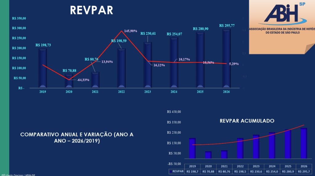 RevPar de março/26: R$ 323,72. Acumulado do ano: R$ 295,77. Variação positiva em relação a fevereiro: 13,47%.
