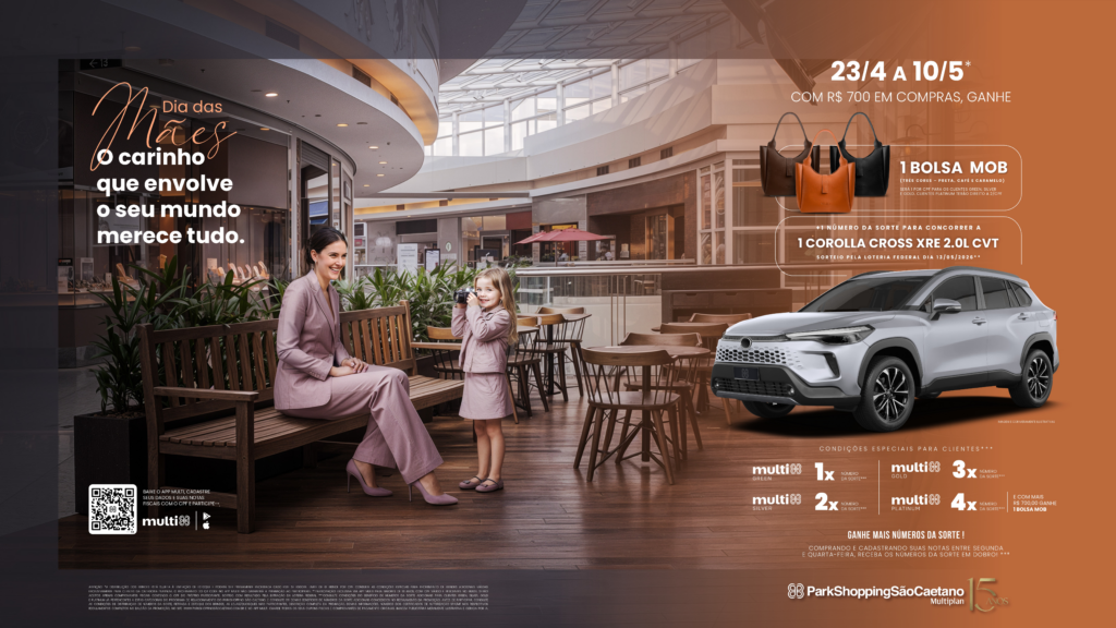O brinde é limitado a uma unidade por CPF para clientes das categorias Green, Silver e Gold do Programa de Relacionamento Multi. Já os clientes Platinum têm direito a até duas unidades por CPF. Além da bolsa, a campanha contará com o sorteio de um Corolla Cross XRE 2026. E ainda, os clientes cadastrados no Programa de Relacionamento Multi contam com vantagens. Clientes Green recebem um número da sorte; clientes Silver ganham o dobro; clientes Gold recebem três números; e clientes Platinum acumulam quatro vezes mais chances no sorteio. Durante o período da promoção, compras realizadas e cadastradas pelo app Multi entre segunda e quarta-feira garantem números da sorte em dobro, independentemente da categoria do cliente. O programa ainda oferece a possibilidade de ampliar as chances no sorteio por meio da troca de pontos. Ao atingir R$ 700 em compras, clientes de todas as categorias podem resgatar um número da sorte extra utilizando 350 pontos. Clientes Green podem resgatar até dois números adicionais, enquanto clientes Silver, Gold e Platinum podem resgatar até cinco números extras. Para participar, é obrigatório cadastrar as notas fiscais com CPF no app Multi. Após o cadastro, será gerado um QR Code, que deverá ser apresentado no balcão da promoção, localizado no Piso L2, próximo ao Multiplan Hall, para a retirada do brinde. O QR Code não garante a disponibilidade da bolsa — a troca deve ser feita enquanto durarem os estoques ou até o fim da promoção. O sorteio do carro será realizado pela Loteria Federal no dia 13 de maio, e a divulgação do ganhador acontecerá a partir do dia 14 de maio. Os regulamentos completos das promoções poderão ser consultados no site do ParkShopping São Caetano e no app Multi. Serviço: Dia das Mães ParkShopping São CaetanoData: 23/04 a 10/05/2026Local de retirada dos brindes: Piso L2 – próximo ao Multiplan HallRegulamentos disponíveis em: www.parkshoppingsaocaetano.com.brEndereço: Alameda Terracota, 545 – Bairro Cerâmica – São Caetano do Sul/SPInstagram: @parkshoppingsaocaetanoYouTube: YouTube ParkShopping São Caetano#EunoPSC #DiadasMaesnoPSC |