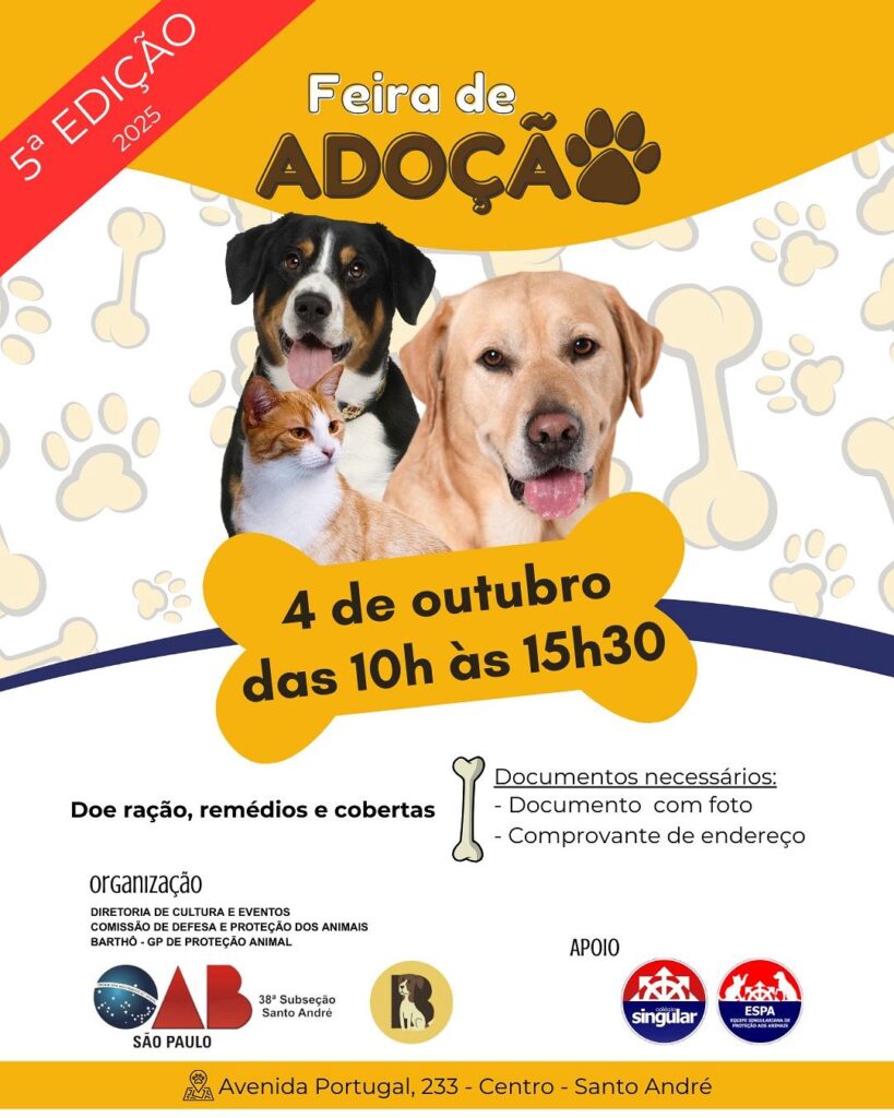 Com apoio da Equipe Singulariana de Proteção aos Animais (ESPA) do Colégio Singular, com unidades na região do Grande ABC, no próximo dia 4 de outubro (sábado), a partir das 10 horas, a Comissão de Defesa e Proteção dos Animais da OAB Santo André realizará mais uma edição da Feira de Adoção Animal.