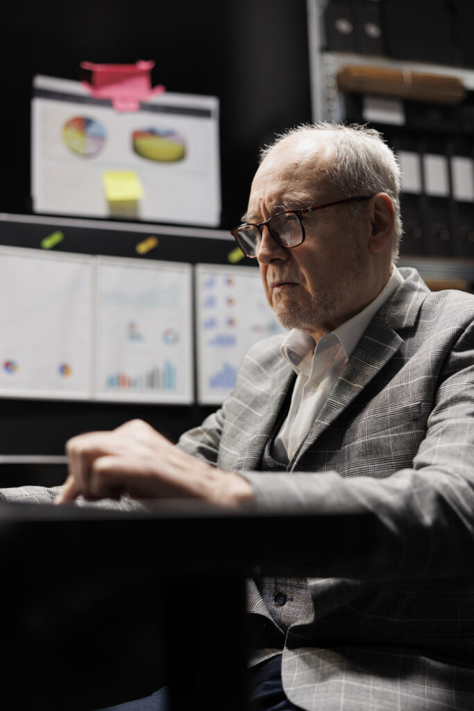 Senior manager checking annual profit revenue measurements, doing objective completion evaluation before business consulting meeting. Bureaucratic workplace filled with graphic charts