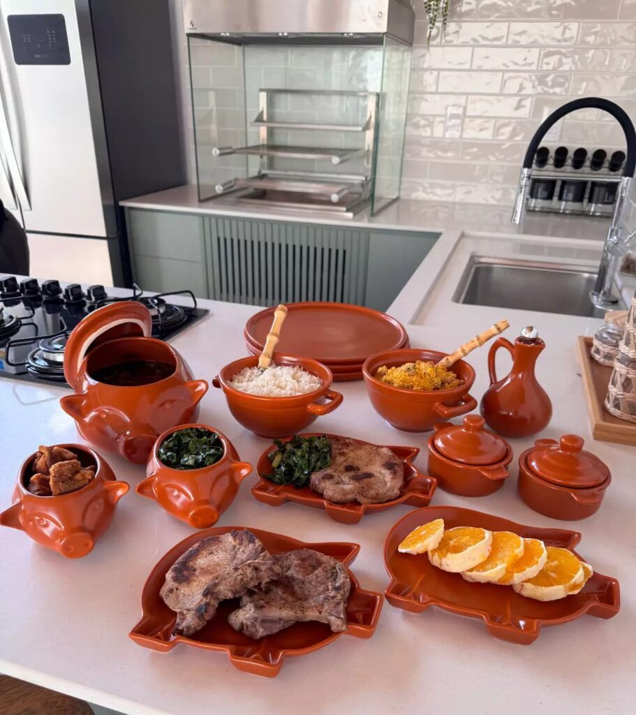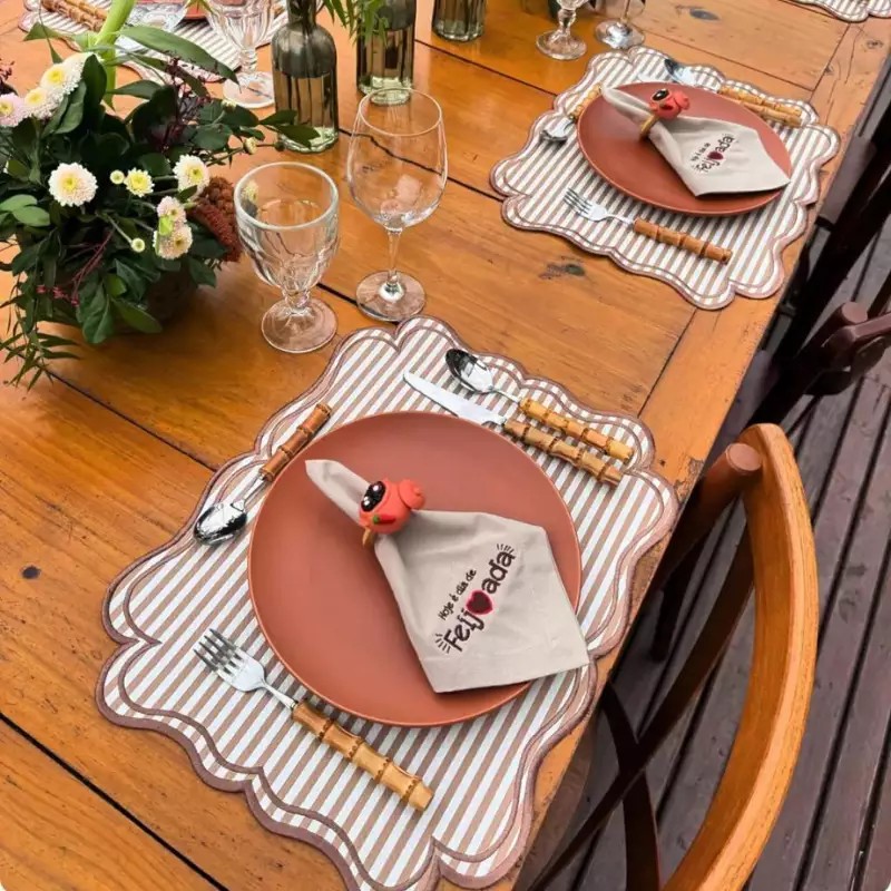 Nas fotos, a escolha pela cerâmica em tons terrosos cria uma base acolhedora e remete diretamente às raízes da culinária brasileira. Travessas e panelas no mesmo tom trazem unidade visual e deixam a mesa mais harmônica, além de práticas para servir. Os detalhes fazem toda a diferença: talheres com cabos de bambu, jogos americanos em listras neutras e guardanapos de tecido personalizados ajudam a elevar a produção sem tirar o clima despretensioso.