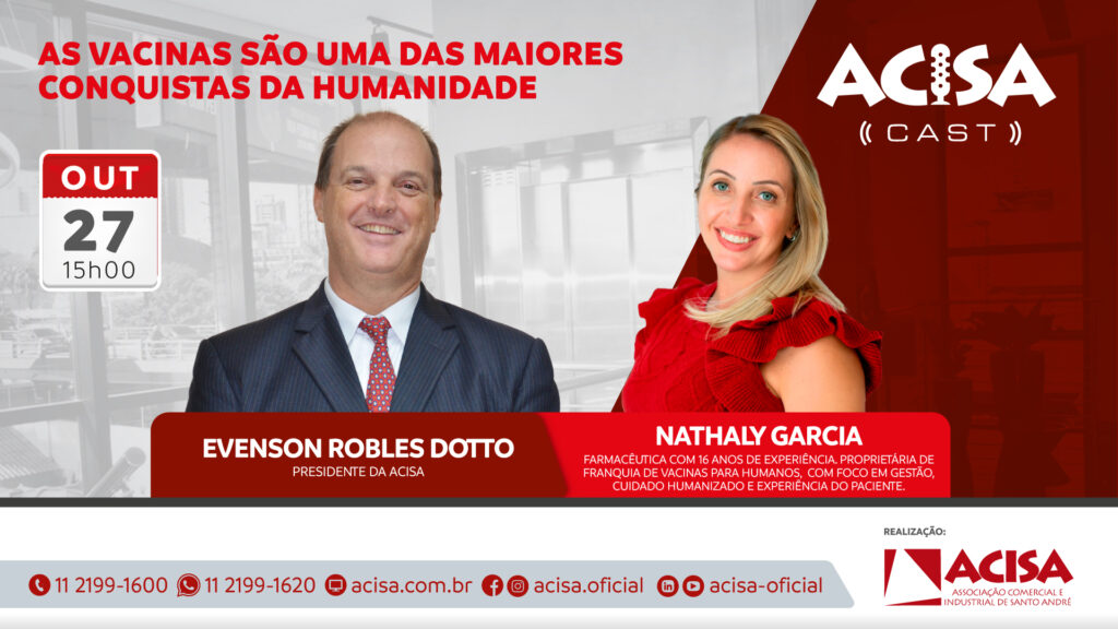 Para debater o poder das vacinas, o próximo episódio do ACISA Cast – podcast da Associação Comercial e Industrial de Santo André – contará com a participação da farmacêutica Nathaly Garcia. A transmissão será realizada na segunda-feira (27), às 15h, pelo canal YouTube.com/@ACISA-OFICIAL, com mediação do presidente da ACISA, Evenson Robles Dotto.