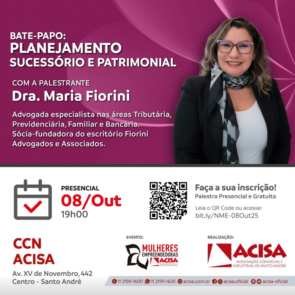 Na próxima quarta-feira (8 de outubro), às 19h, o Núcleo de Mulheres Empreendedoras (NME) da Associação Comercial e Industrial de Santo André (ACISA) realizará um bate-papo sobre planejamento sucessório, patrimonial e gestão de risco, no Centro de Capacitação e Negócios da entidade.