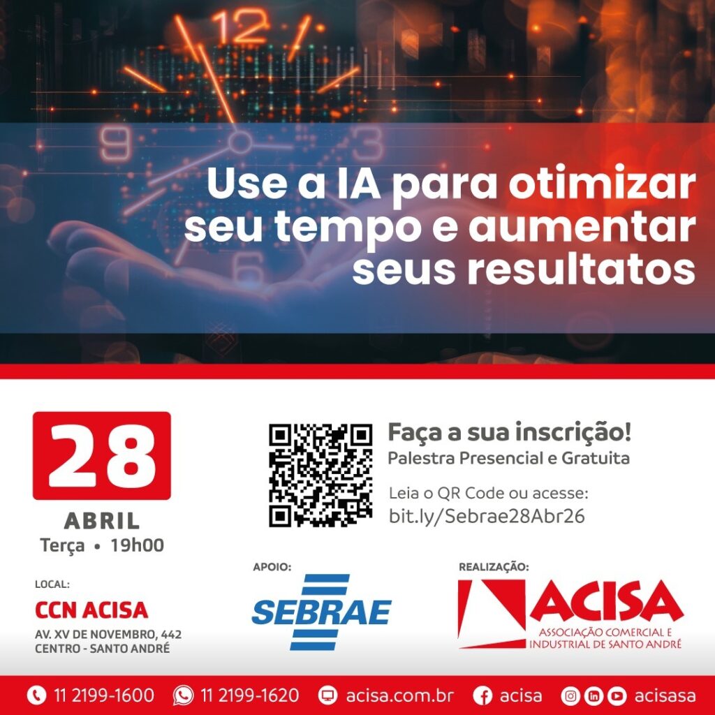 No dia 28 de abril (terça-feira), às 19h, no Centro de Capacitação & Negócios da ACISA, será realizada a palestra Use a IA para otimizar tempo e aumentar seus resultados. Para participar, os interessados deverão fazer gratuitamente a sua inscrição por meio do link: