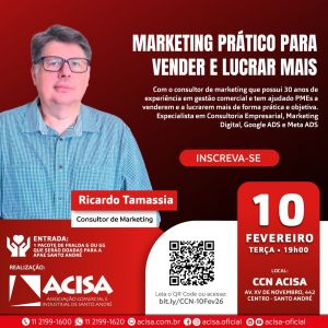 Empreendedores que desejam vender e lucrar mais utilizando o marketing de forma estratégica têm encontro marcado no dia 10 de fevereiro (terça-feira), às 19h, no Centro de Capacitação & Negócios da ACISA – Associação Comercial e Industrial de Santo André.