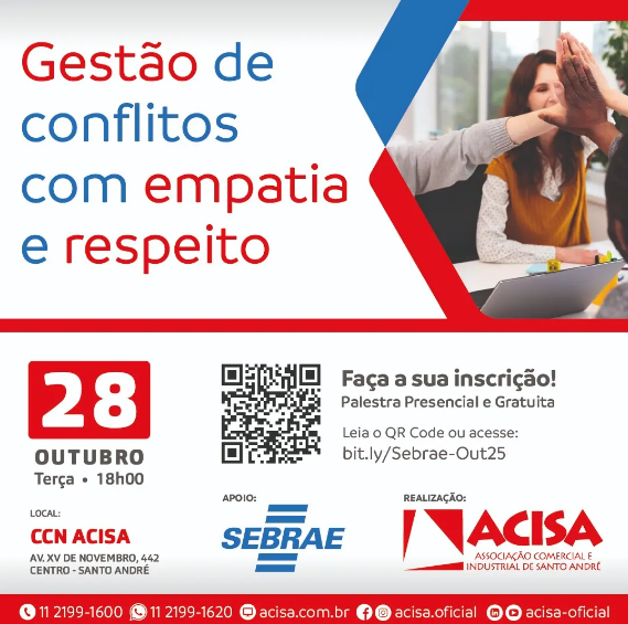 Para tratar desse tema, a ACISA – Associação Comercial e Industrial de Santo André sediará uma palestra totalmente gratuita em parceria com o Sebrae-SP, na terça-feira (28 de outubro), às 18h, no Centro de Capacitação & Negócios.