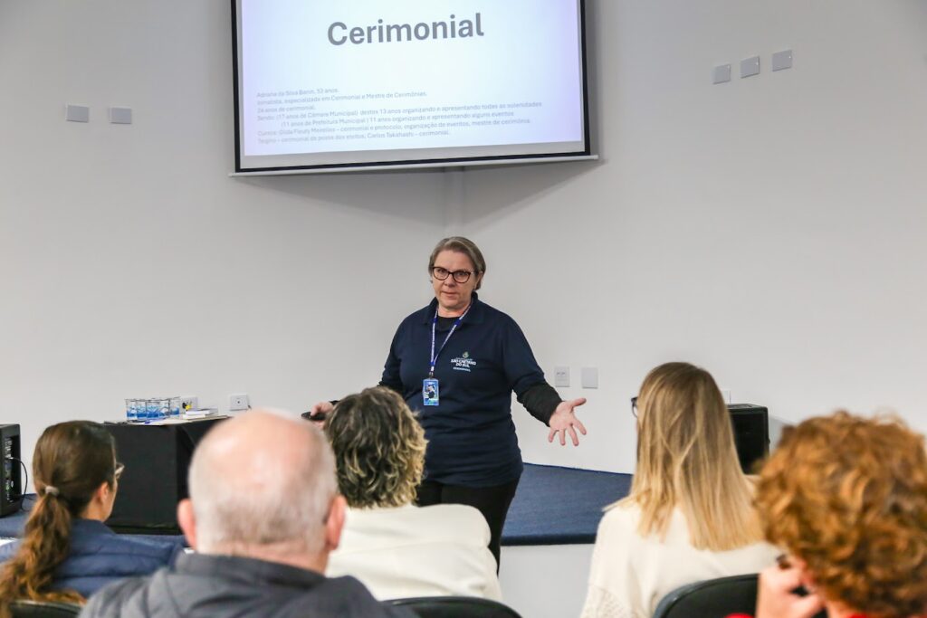 Adriana Banin, que é jornalista especializada em Cerimonial e Mestre de Cerimônias, tem 24 anos de experiência na área: 17 atuando na Câmara Municipal e os últimos 11 na Prefeitura de São Caetano. Ela explanou sobre as origens das práticas de cerimonial e de boas maneiras na história da humanidade, as competências básicas de um cerimonialista, a sequência padrão de uma solenidade ou evento e conceitos como precedência, lugares de honra para anfitriões e convidados, posicionamento e hasteamento de bandeiras: