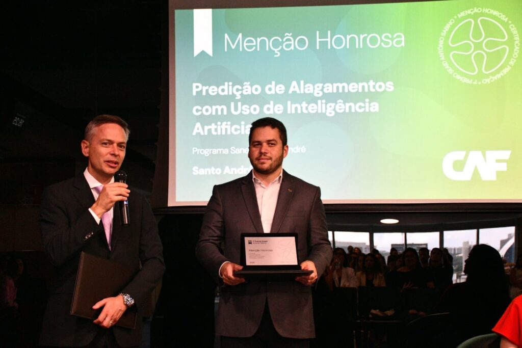 Responsável por receber o certificado de premiação e a placa de menção honrosa, o prefeito de Santo André, Gilvan Ferreira, destacou a importância do uso de tecnologia para ações preventivas. “Este sistema de inteligência artificial amplia a nossa capacidade de prevenção e resposta, integrando diversas secretarias para ficarem em estado de alerta frente a possibilidade de eventos extremos. Isso significa que Santo André vem se preparando ainda mais para proteger vidas e se tornar mais resiliente, principalmente nos territórios vulneráveis”, explica.