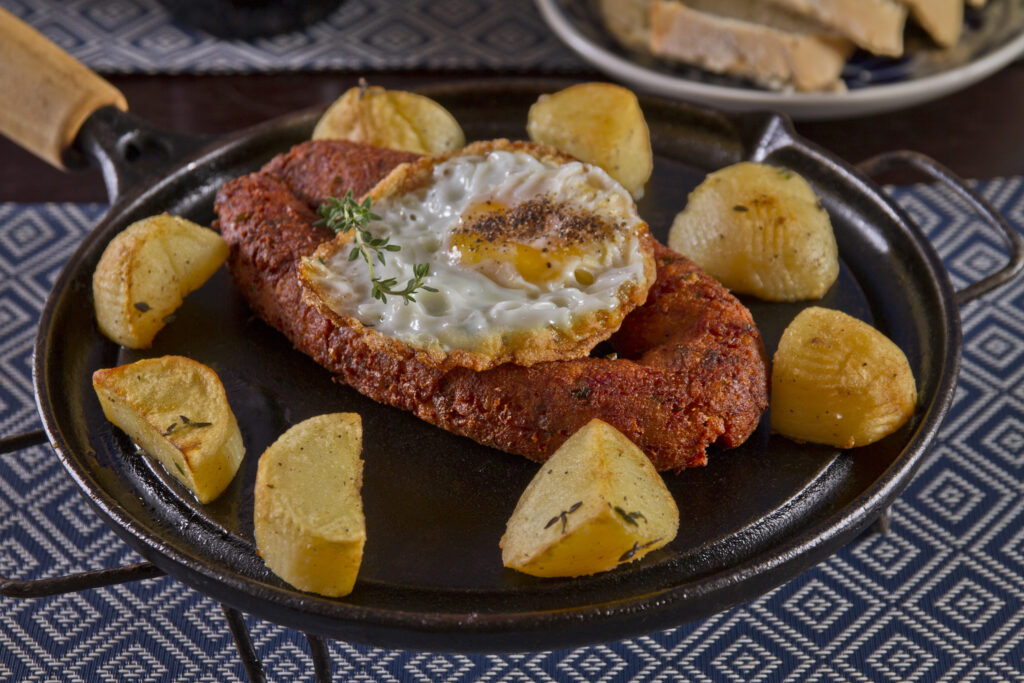 Os menus são organizados por número de pessoas, duas, quatro, seis ou até dez, e estruturados como uma refeição completa, com entrada, prato principal e sobremesas. Entre os destaques estão os bolinhos de bacalhau, preparados de forma artesanal, e a alheira defumada, embutido típico português que reforça o caráter tradicional das combinações.