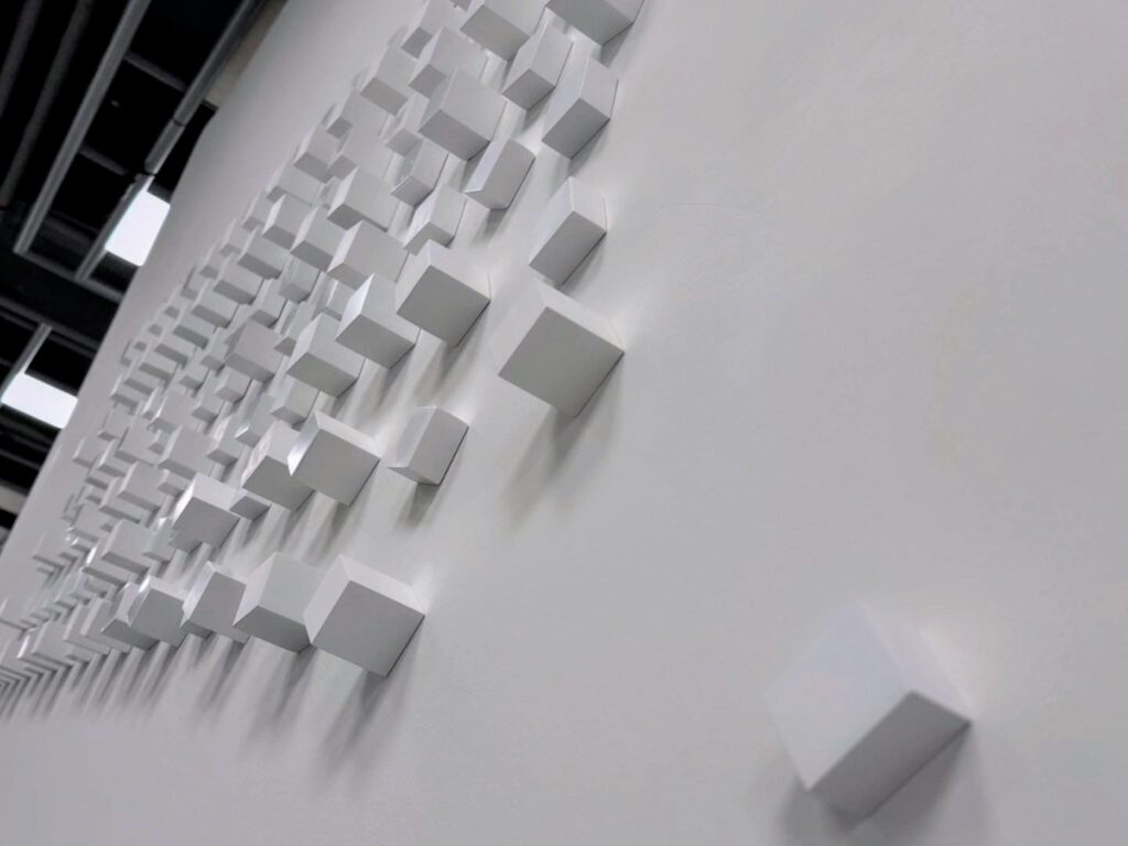 As sequências binárias incorporadas às obras correspondem a palavras ou mensagens, revelando gradualmente uma camada de linguagem codificada. O que inicialmente se apresenta como uma organização geométrica precisa transforma-se num campo de tensão entre estrutura racional e experiência sensível.
